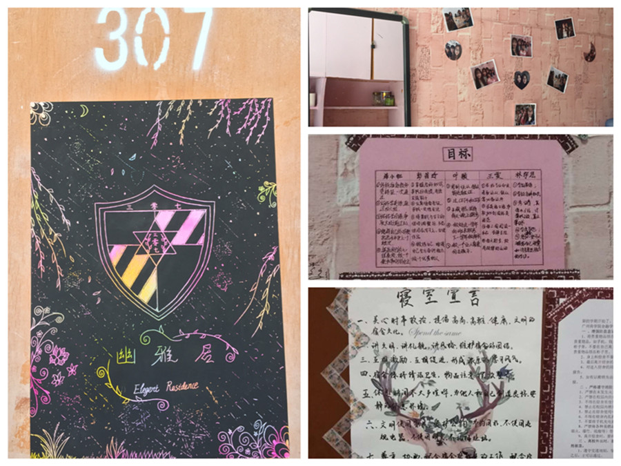 金融学院17级金融7班公寓12栋307舍,在公司严格的卫生宿舍评比中脱颖而出,并在领导的支持下以该宿舍为模板打造校级卫生样板间。此次观摩,深获员工处领导及各公司党总支书记认同,并获得相应表彰。明之尚美,馨德亦缘。307室的同学们秉持此道,规范自我,提倡勤俭节约,并将其落至实处。在班长及宿舍长的带领下,成员们力争上游,互相督促,发奋图强,平均绩点高达3.5。与此同时,该宿舍成员和睦相处,互帮互助,打造了属于其自身的宿舍文化,比如宿舍舍徽、宿舍公约、寝室宣言、目标墙、照片墙等等,营造了温馨和谐的生活氛围以及干净舒适的生活环境。