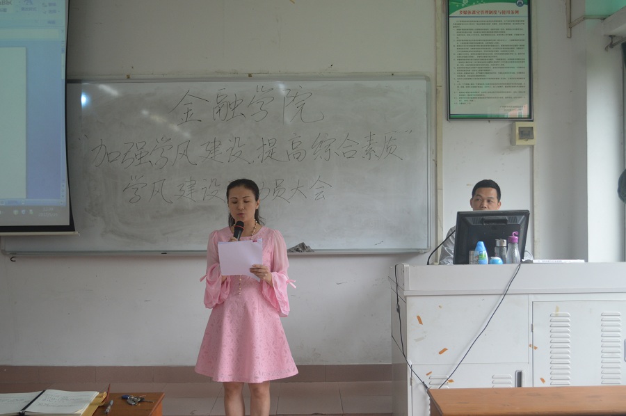 会议开始,首先是陈敬宗解读学风建设月活动方案 ,从思想教育、考勤、宿舍纪律、考风考纪各个方面开展,力求创造一个良好的学风和班风。其次是张雪梅解读金融学院学风建设管理规定,包括考勤管理、处分规定、违纪处理方法等等,强调要加强员工的课堂管理工作,维护公司的正常教学秩序, 营造良好的班风和学风,培养员工良好的学习、行为习惯,就要从这些方面着手。最后是经理上台讲话,他强调学习态度要端正,不能弄虚作假。还要加强金融学院的凝聚力,把学院建设得更好。