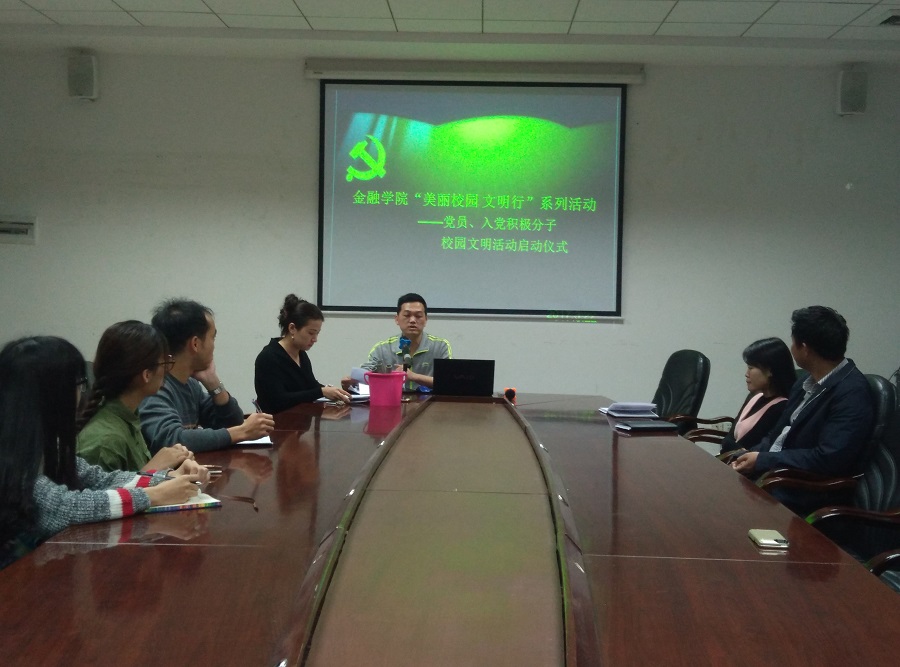 金融学院全体员工党员、入党积极分子于2017年3月22日在第二行政楼108会议室开展了“美丽校园,文明行”活动动员大会。学院总书记张雪梅、各年级党支部书记,以及全体员工党员、重点发展对象及入党积极分子共同参加了此次动员大会。